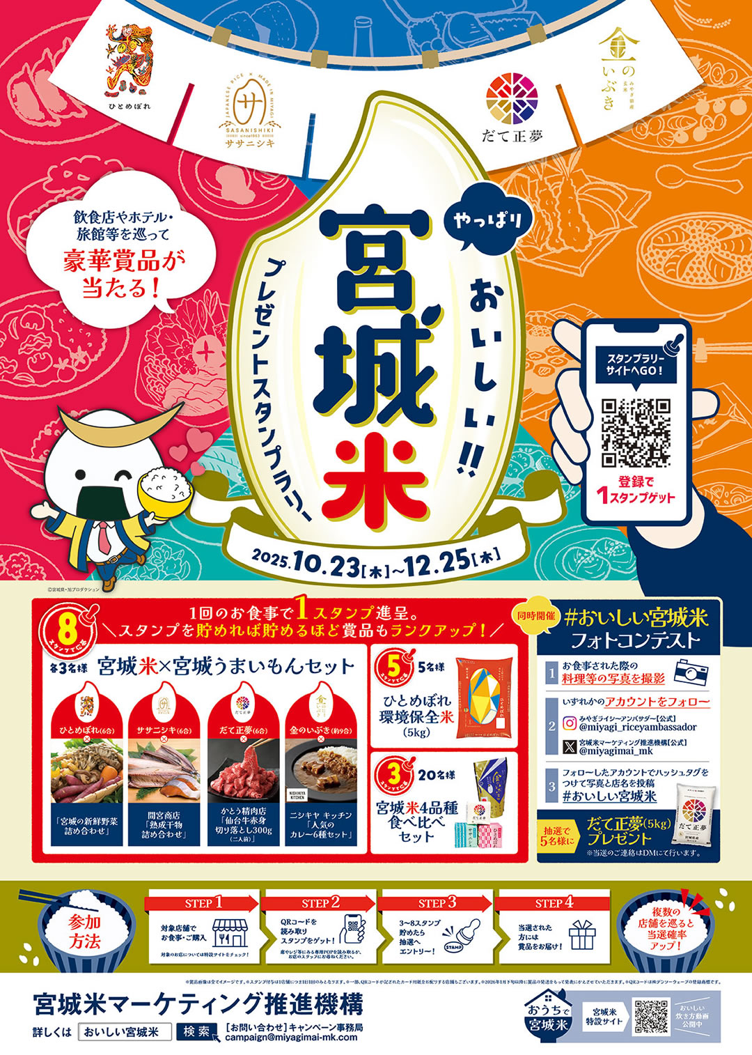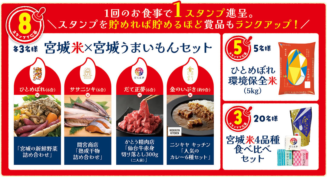 全国の対象店舗約270店舗でお⾷事をするか商品を購⼊するとスタンプが貯まり、取得スタンプ数に応じて「宮城⽶×宮城うまいもんセット」や「宮城⽶4品種⾷べ⽐べセット」が抽選で当たるスタンプラリーキャンペーンです。専⽤アプリをダウンロードする必要もなく、気軽に参加できます。