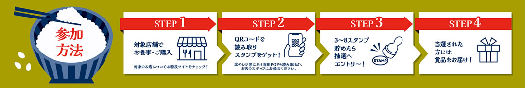 対象店舗でお食事・ご購入後、店舗内に掲出されているスタンプ取得用A型POPに記されたQRコードをスマホで読み取ることで、スタンプが1個付与されます。期間中、対象店舗を巡ってスタンプを貯めると、賞品にご応募いただけます。複数店舗を巡ると当選確率がUPします。