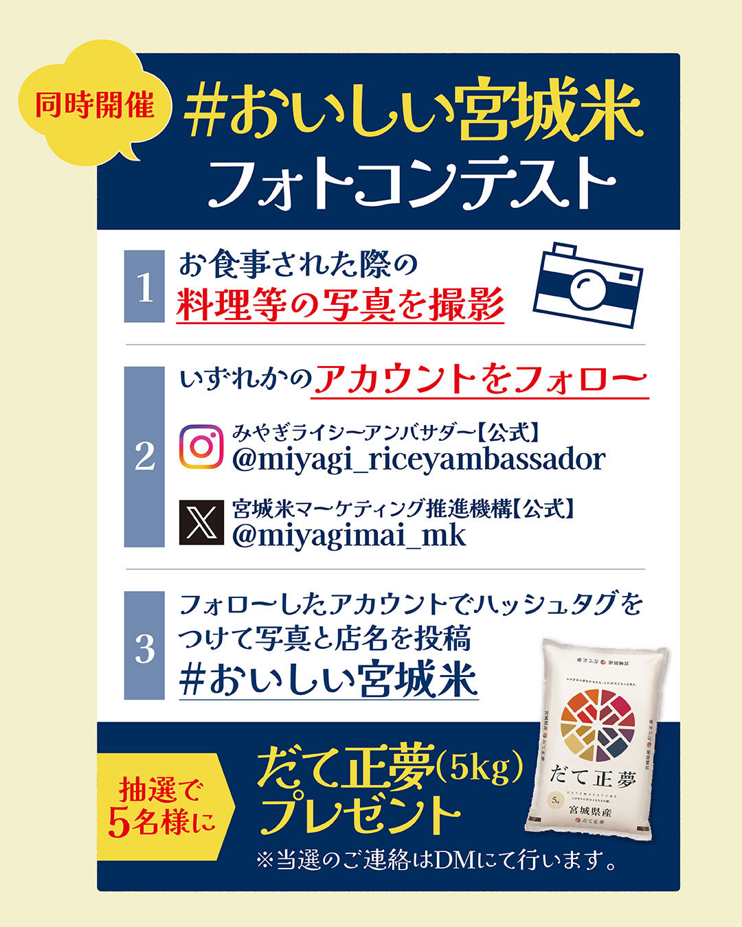 対象店舗利用時の写真を自身のInstagramやXのアカウントで一定の条件を満たして投稿すると、「だて正夢」5kgが当たるフォトコンテストも同期間で開催します。