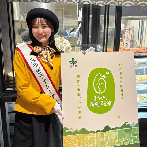 販売初日となる11月10日(月)はみやぎライシーアンバサダーが店頭に立ち、購入いただいた方や立ち寄られた方に「みやぎの環境保全米」の取組やひとめぼれについて直接ご紹介しました。